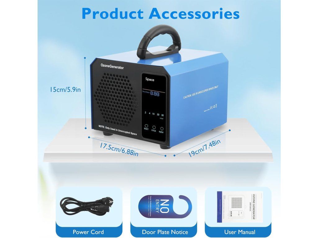 Profesionální ozonový generátor a čistič vzduchu Ozone Generator 60mg Space s chytrým časovačem. Ozonový generátor disponuje vysoce výkonnou oxidaci ozónu 60 000 mg/hodinu. Tím důkladně zlikviduje nepříjemných zápachů, plísní, bakterií, choroboplodných zárodků a virů v prostorách s velikosti až 500 m2. Čistička vzduchu disponuje digitálně integrovaným časovačem 10 až 120 min.