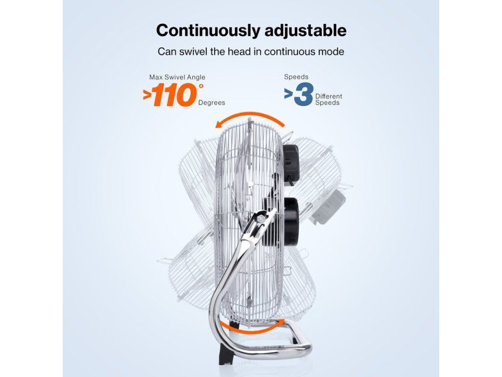 Kromě vysokého chladicího výkonu má podlahový ventilátor 3 rychlostní stupně a praktický prostor pro uložení kabelu. Úhel sklonu lze nastavit až do 110°.